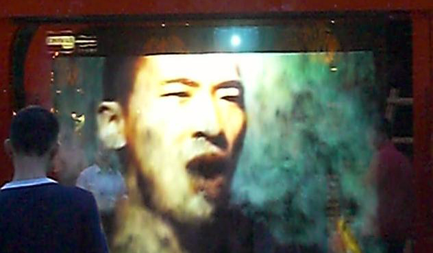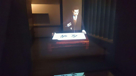 觀眾看到墻面上多個(gè)顯示設(shè)備中,每個(gè)顯示畫面中都有人物的視頻靜止影像。每臺電視下都有一個(gè)控制按鈕(可以是自動感應(yīng)器),當(dāng)觀眾按到其中一個(gè)時(shí)(當(dāng)自動感應(yīng)器撲捉有人接近 ……